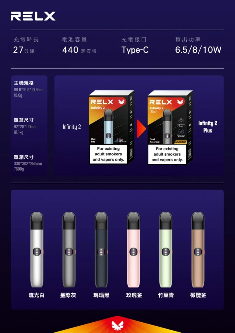 RELX電子菸悅刻6代際擁有三重功率選擇,讓你隨心調整口感;提供6色選擇,時尚有型;Type-C極速充電,配備440mAh電池容量,續航持久。
